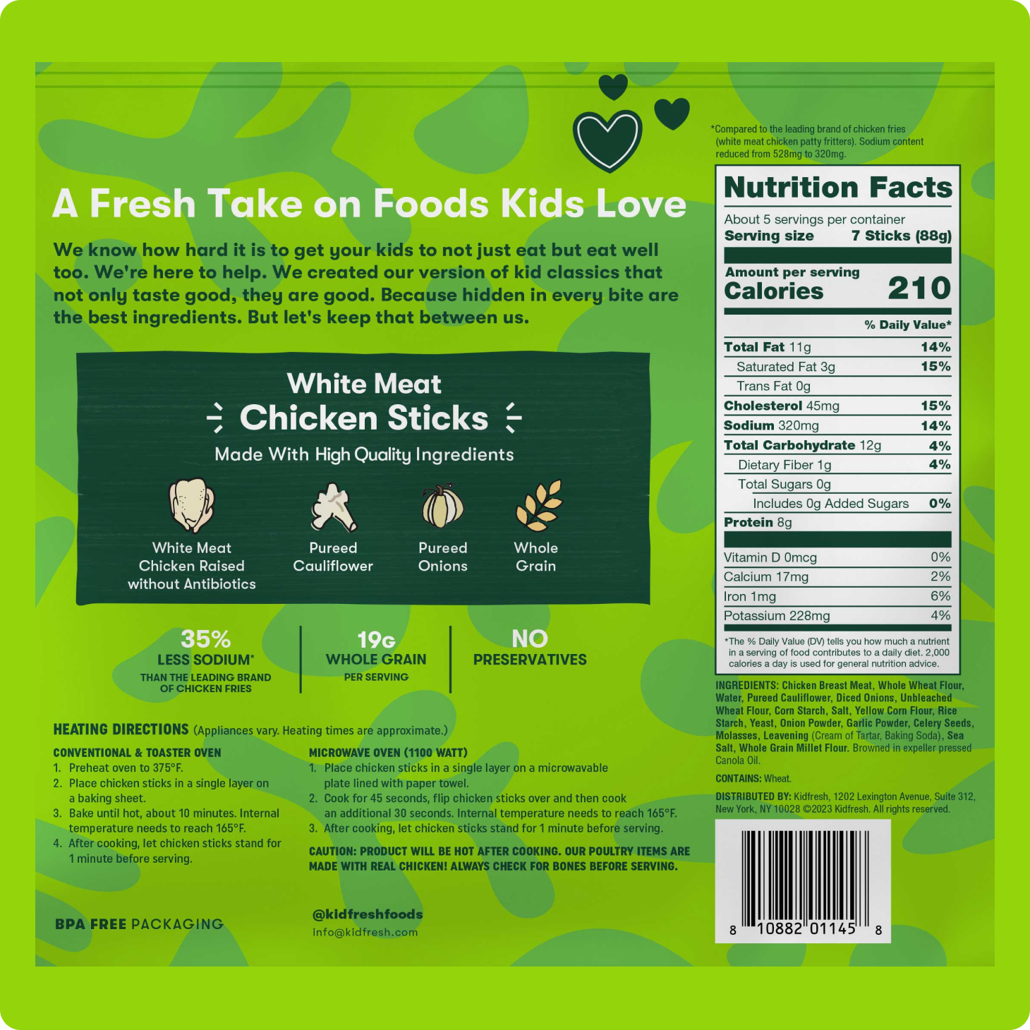 Perfectly crispy sticks that are easy for kids to pick up—and an easy pick for parents. We give them a boost of wholesome goodness from cauliflower, whole grains, and antibiotic-free chicken—and no artificial flavors or ingredients.